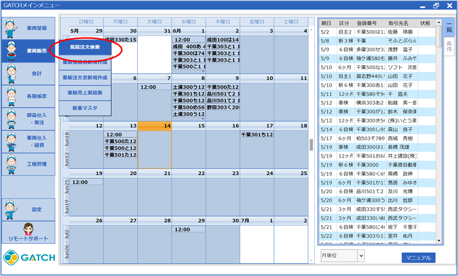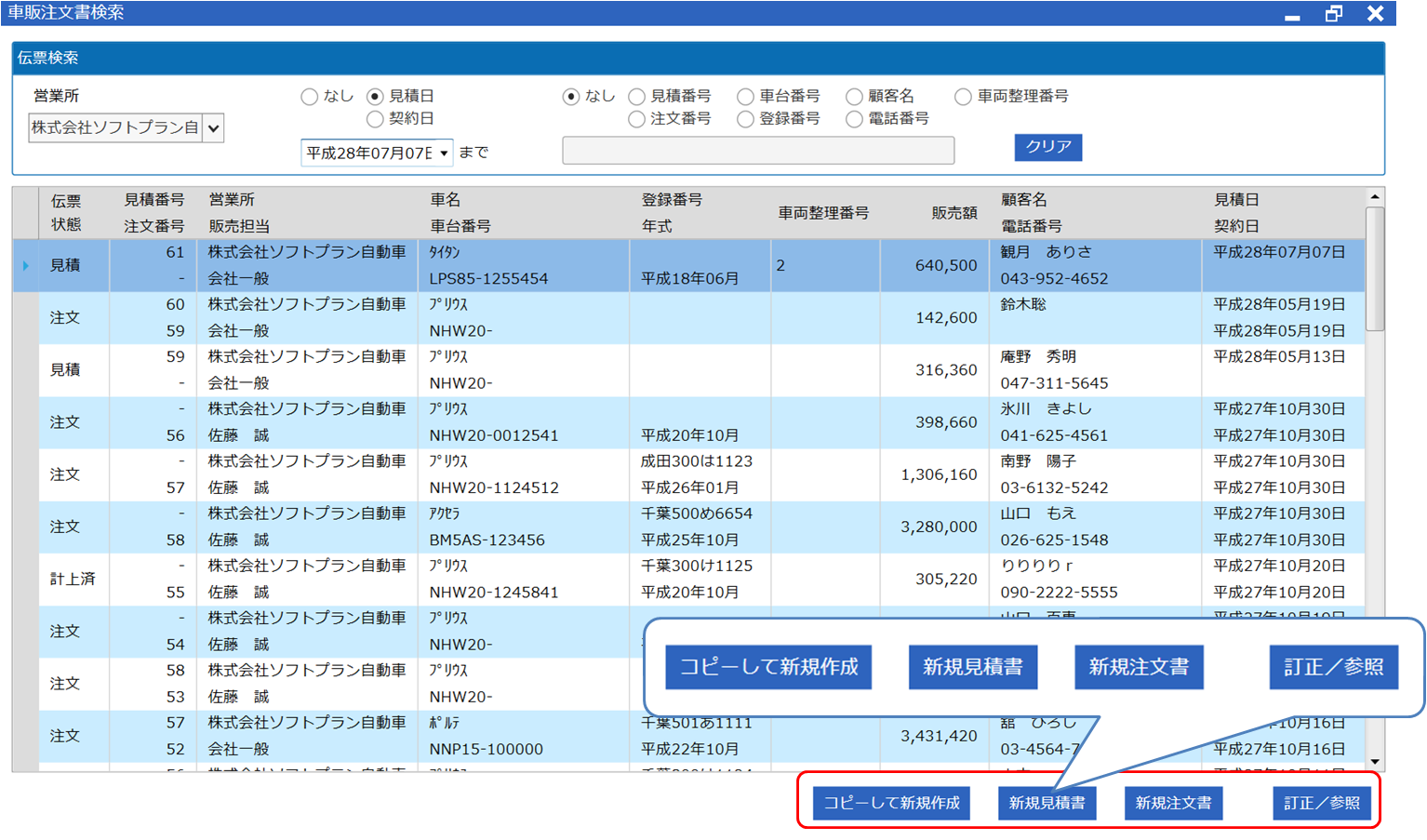 車両販売用の見積書・注文書伝票の検索ができます。